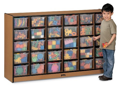 Sproutz 30 Tray Mobile Storage With Clear Trays - Black - School & Play Furniture?Generous cubbie tray storage in an eco-friendly unit. 57½" wide x 15" deep x 35½" high. Made with 100% recycled wood fiber.. Promotes better indoor air quality.. May help contribute to five LEED® credits.. Edgebanding in four colors.. KYDZSafe® edges. KYDZStrong® construction. KYDZTuff® finish. Caster mounted. Contact your Jonti-Craft dealer for specific tray colors.. Learn more at www.Sproutz.biz. Five year warranty.