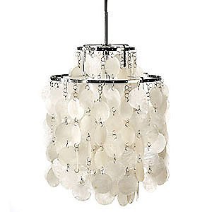 #Design by Verner Panton, 1964.Pendant with Mother of pearl discs on 2 ring metal frame. Equipped with chrome ceiling canopy and 157 inches of black wire.Dimensions 10.6"D X 16.9"H. Uses 1 X 60W 120V E26 (medium base) clear incandescent lamp (not included).